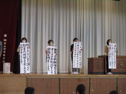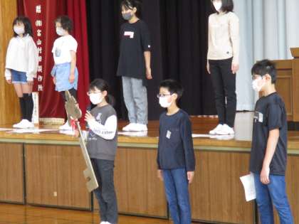 児童会発足式がありました。各委員会の委員長が、校長先生から任命書を受け取った後、それぞれの委員会のスローガンを発表しました。