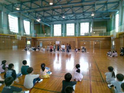 2年生さんに楽しい集会を開いてもらいました。「おちたおちた」ゲームや学校探検、ダンス等、楽しい時間を過ごしました。