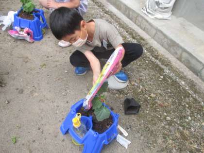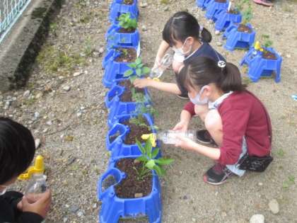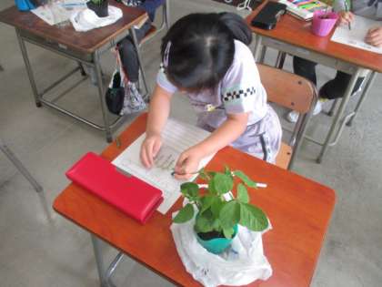 生活科の学習で、野菜の苗を植えました。苗を観察し、葉の色や形、におい等をカードに記録しました。
