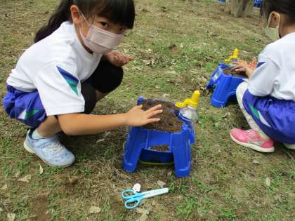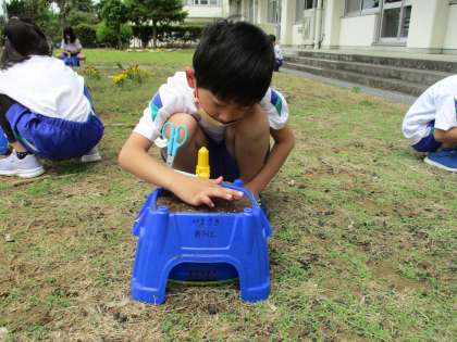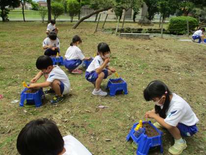 あさがおの種を植えました。たくさんの花、きれいな花が咲いてほしいという思いを込めて植えました。