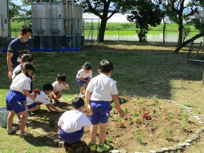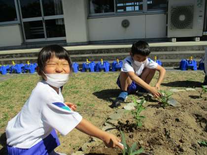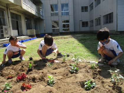 一年生の花壇に新しい花を植えました。1年生みんなで、大切に育てようね。