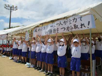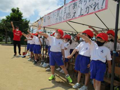応援合戦の様子です。 高学年の応援に合わせて、手拍子を中心にがんばりました。