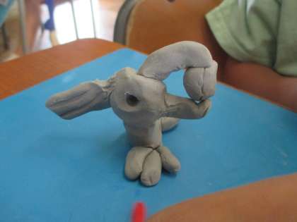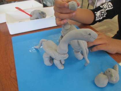今日は、動物や乗り物をつくりました。国語科「くちばし」に登場する種をくわえたオウムをつくっている子供もいました。