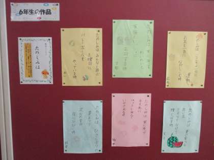 給食のことや放課後のこと、習い事のことなど、子供たちのわくわくした気持ちが伝わる短歌が仕上がりました。現在、廊下や職員室前に掲示しています。