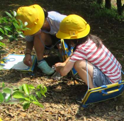 中庭で「生き物見付け(生活科)」をしています。どこにどんな生き物がいるのか、話をしながら探しました。