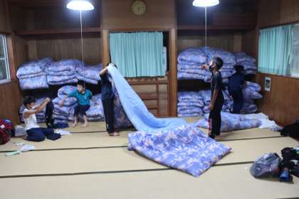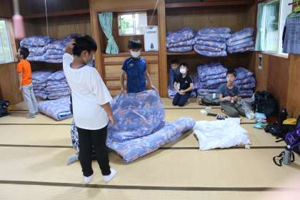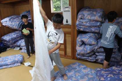 2日目の始まりは、部屋の片付けからスタートです。使った布団やシーツ等を協力しながら片付けました。