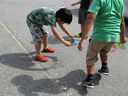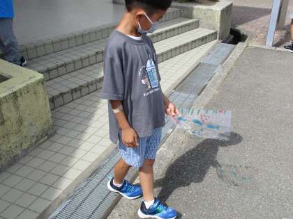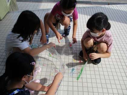 図画工作科で「ひかりのプレゼント」の学習をしました。色のシールを貼ったりペンで絵を描いたりしたシートに、光を通してみました。シートの向きを変えたり、友達の作品と重ねたりして、地面に光が映るのを楽しみました。