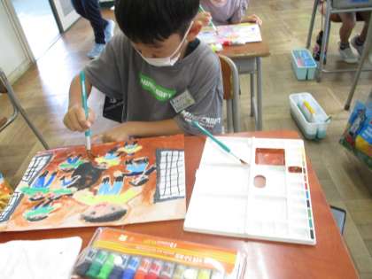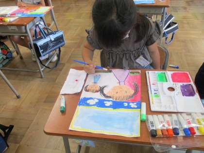 図画工作科の学習では、クレヨンと水彩を用いて学校生活で楽しいことや嬉しいことを絵に表しました。