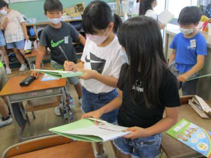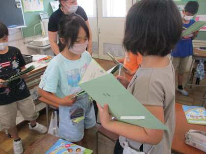 外国語活動では、好きな色を尋ねたり、答えたりする活動をしました。「What color do you like?」「I like blue.」などと、上手に会話をしていました。