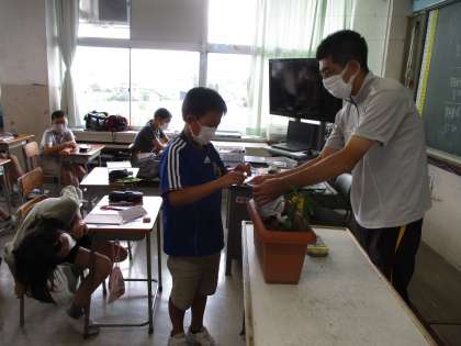 理科の学習では、生き物の関わりについて学んでいます。植物は、日光が当たることで二酸化炭素を吸収し、酸素を出していることを実験で確かめることができました。