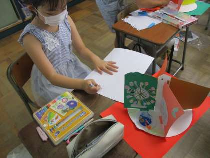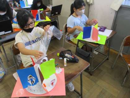 図画工作科では、「くるくるランド」の製作をしています。くるくる回る仕組みを生かして、遊園地やサーカス等、様々な場面を表現しています。