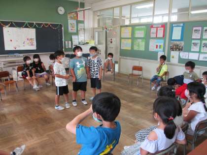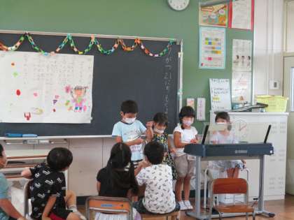 1学期友達となかよくげんきにがんばれたので、集会を開きました。係ごとに考えた出し物や、かざりで楽しい時間を過ごしました。