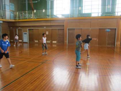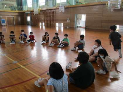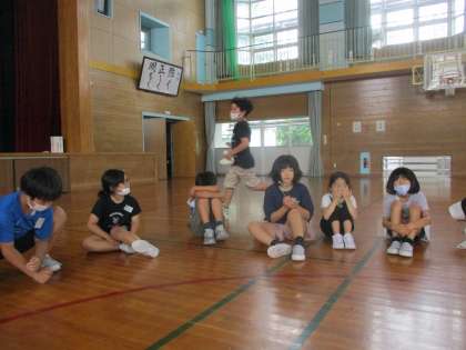 1学期最後の集会をしました。みんなで決めた遊びの、ハンカチ落としとドッジボールをして楽しみました。
