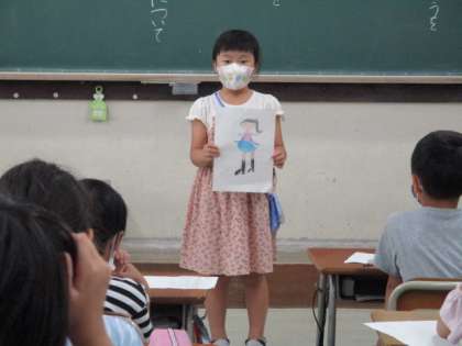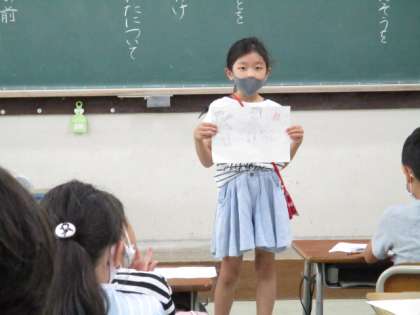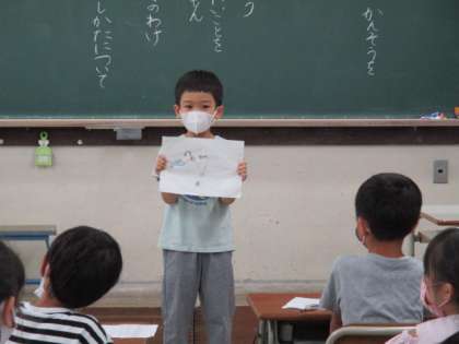 国語科で、あったらいいなと思うものを考えました。絵を描いたり、発表メモを書いたりしました。どんな話し方をしたらよいかを考え、グループの友達やみんなの前で話しました。