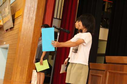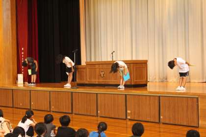 「かがやき発表」では、代表の児童が全校児童の前で、堂々と1学期に頑張ったことを発表しました。