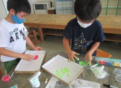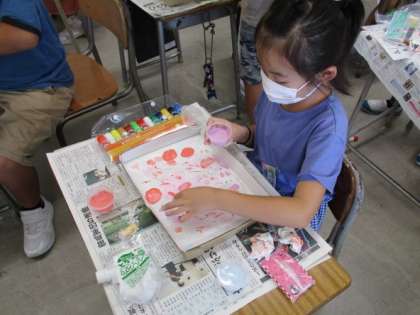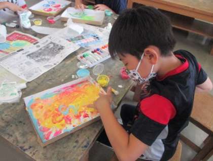 図画工作科「とろとろえのぐでかく」の学習をしました。液体粘土の感触を楽しみながら、思いついたことを表しました。絵の具を混ぜていろいろな色を作り、指や手で描きました。