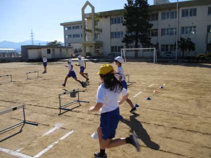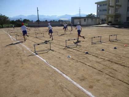 体育では、ハードル走をしています。抜き足に気を付けながら練習することができました。50メートル走のタイムとの差を縮めることを目標に取り組んでいきます。
