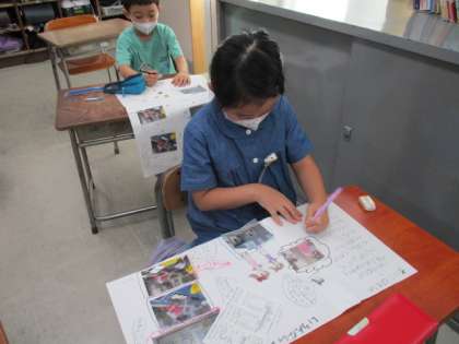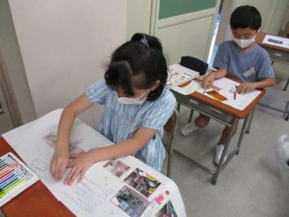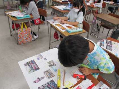 生活科の町探検を通して、発見したことや思ったことなどをまとめています。絵や文をかいたり、写真を貼ったりするなど、工夫しながらまとめています。