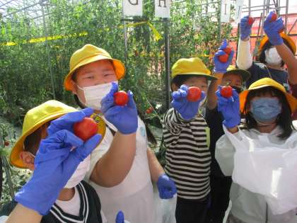 野菜の収穫体験をさせていただきました。トマトと里芋を収穫し、嬉しそうな子供たちです。