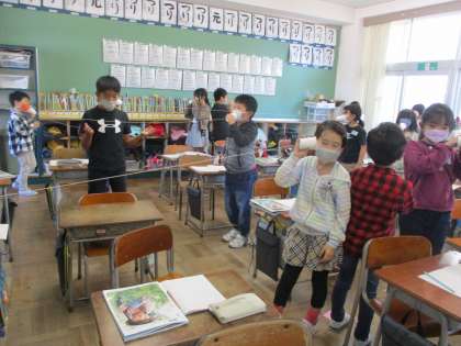 音が出ているとき、音を伝える物は震えているのかを糸電話で調べました。糸を触ると、震えていることが分かりました。