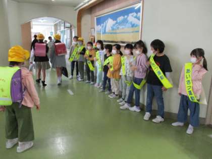 目と目とつないで、いろいろな学年の人に挨拶をしました。