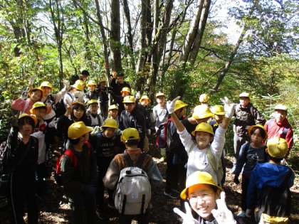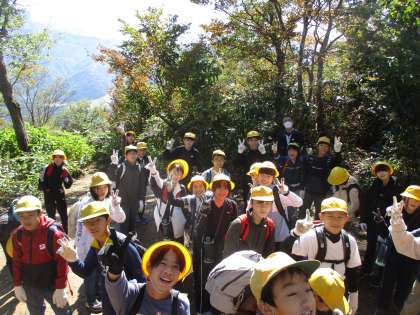6年生宿泊学習、1日目の来拝山登山の様子です。