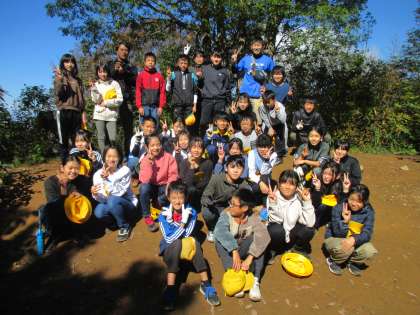 6年生宿泊学習、1日目の来拝山頂上で撮った集合写真です。