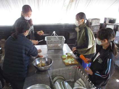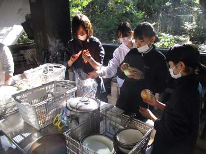 6年生宿泊学習、2日目の野外炊飯の様子です。