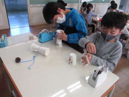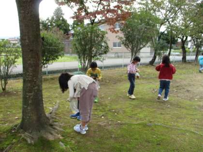 どんぐりを使って「こま」や「やじろべえ」、まつぼっくりを使って「けんだま」を作りました。また、落ち葉の服づくりのために、落ち葉を集めています。