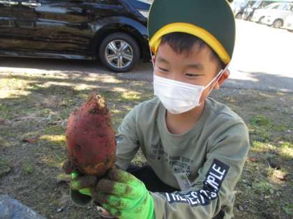 芋掘りをしました。友達と協力し、土の中のさつまいもに傷がつかないよう、やさしく掘り進めました。たくさん芋が見つかって、喜んでいました。