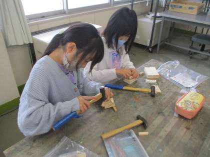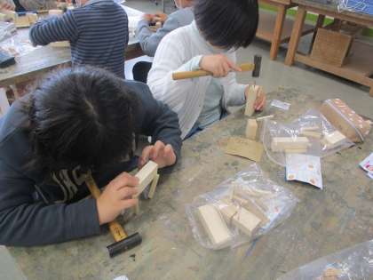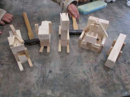 木片を組み合わせて、動物や建物を作っています。げんのうや金槌を正しく使って、上手に釘を打ちました。