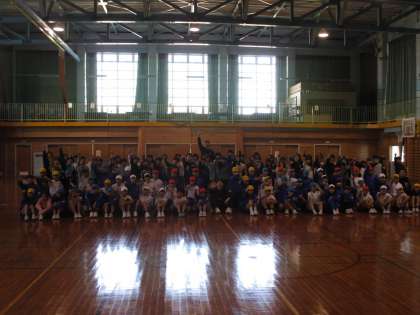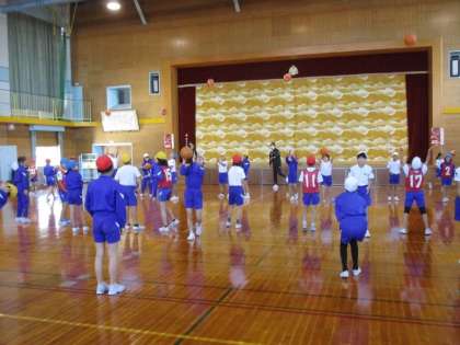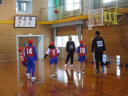 今日は富山グラウジーズから田中健介コーチ・小野龍猛選手・野崎由之選手をお迎えして、「夢作文大募集19学校賞」のバスケットボール教室を行いました。ボールに慣れるトレーニングやドリブルの練習をした後、各クラスの代表と選手で試合をしました。子供たちは選手やコーチの方から少しでも学ぼうとする姿が多く見られました。試合では、選手に負けないよう果敢にゴールを目指し、ゴールが入ると大きな拍手が起きるなど盛り上がりました。最後には、選手から「夢」についてお話をいただき、夢に向かって挑戦し、努力することの大切さを教えていただきました