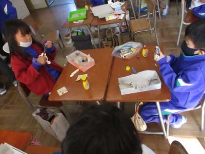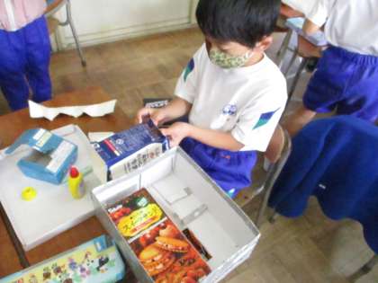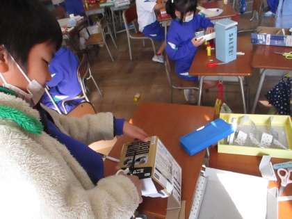 空き箱を使い、どんぐりをコロコロ転がして遊べる物の製作に取り組んでいます。材料を工夫して使いながら、障害物や仕掛け等があるコースを作っています。