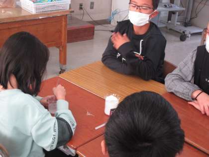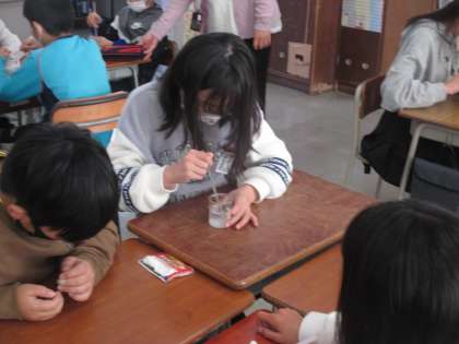 「食塩は水にとけたらどうなるのかな?」と予想をしたり、実験結果から考えたりしながら学習を進めています。水に溶けた食塩やミョウバンの行方は・・・実験が毎回楽しみな子供たちです。
