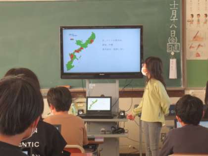 総合的な学習の時間に、沖縄の宝について調べたことをクロムブックでまとめました。画像やグラフを取り入れたり、背景を工夫したりするなど、クロムブックの特性を生かした発表が多く見られました。