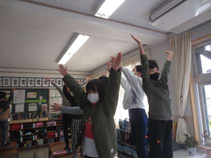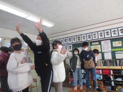 登場人物の気持ちの変容を捉えるため、実際に登場人物の行動をやってみて、どんな気持ちになったかを話し合いました。
