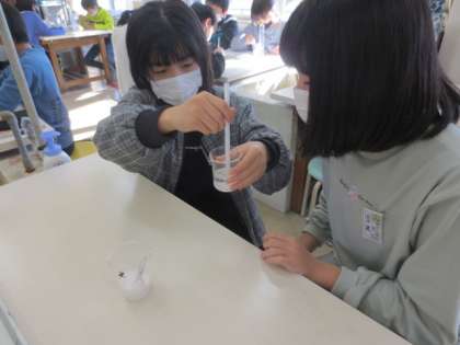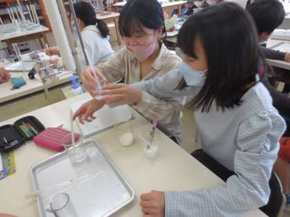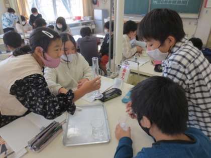食塩とみょうばんが、50mlの水にどれだけ溶けるか実験しました。7つのグループで比べるとほぼ同じ量でした。水の量が同じ場合、溶ける量が決まっていることが分かりました。