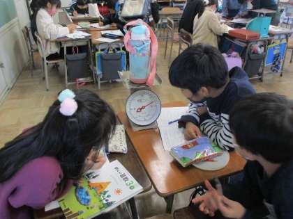 はかりを使って、教室にある物の重さを量りました。1目盛りが表す重さに気を付けて、目盛りを読みました。