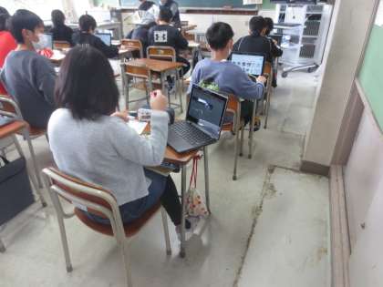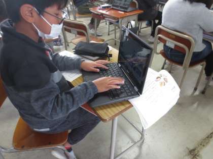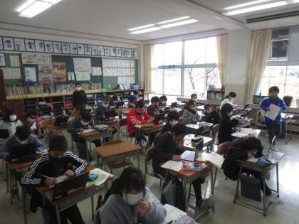 クロムブックを使ってお気に入りの慣用句を調べ、クラスの「慣用句ブック」を作っています。写真は1組の様子です。
