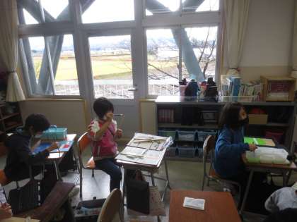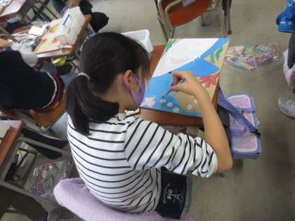 図画工作科では、コリントゲームの学習をしています。台板に丁寧に色を塗る子供たちの姿が見られます。