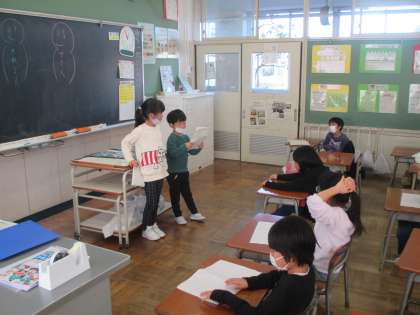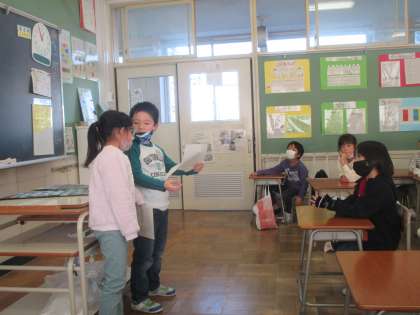 国語科では、今一番楽しいと思っていることについて友達にインタビューし、分かったことをクラスの友達に紹介する活動をしました。