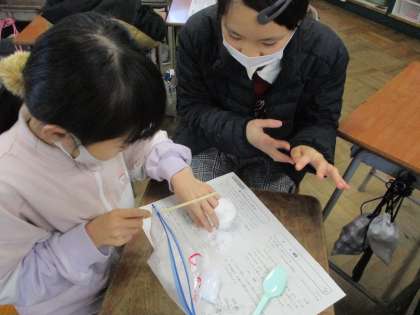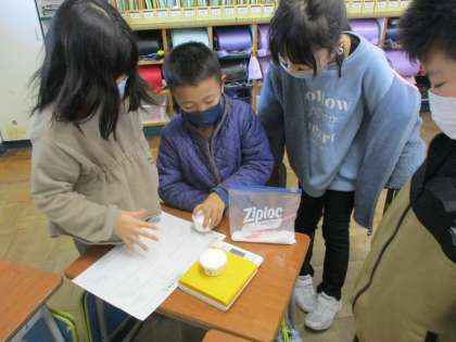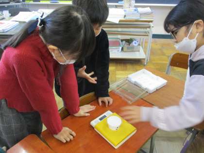 理科では、物の重さについて学習しています。見た目が似ている物の重さを調べました。塩と砂糖の体積を同じにして量ると、見た目は似ていても、重さは違うことが分かりました。