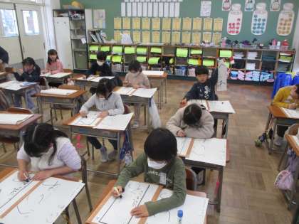 3学期始業式の書き初め大会に向けて、角パスで字を書く学習が始まりました。今年は「へいわ」という字を書きます。