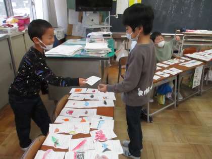 国語科の学習で、ものの名前の学習をしています。ものの名まえを集めておみせやさんごっこをしました。お店屋さんとお客さんを交代でしました。たくさん買ったり、売ったりすることができた嬉しい時間でした。