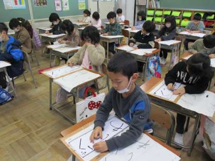始業式後の書初大会では、家庭でたくさん練習してきた成果を出そうと、真剣に取り組む姿が見られました。