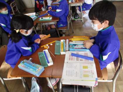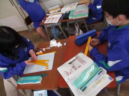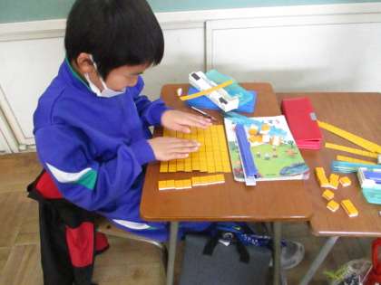 算数科では10のまとまりをつくって、大きい数を数えたり、数の読み書きをしたりしています。一の位と十の位をしっかりと分けてブロックを置けていますね。