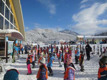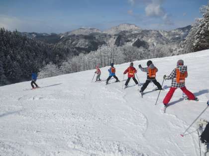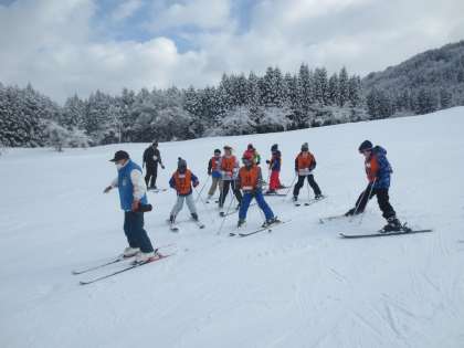 天候にも恵まれ、気持ちよくスキーに取り組む子供たちの様子が見られました。スキー初体験の子供も多くいましたが、インストラクターの先生の話をよく聞き、グループで協力しながら練習に取り組んでいました。
