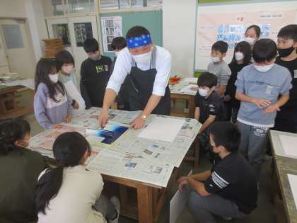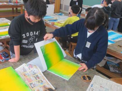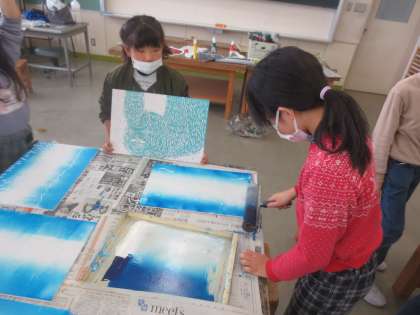 子供たちは、一生懸命彫った台板に絵の具をつけると、「きれいに色が出たらいいな」とつぶやきながら刷っていました。