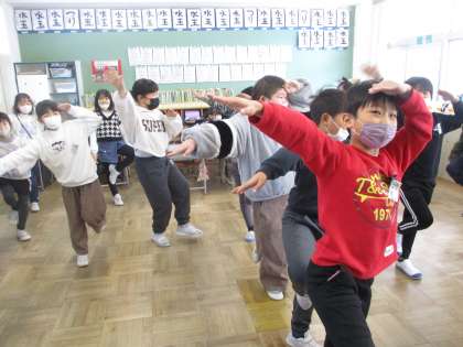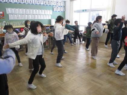 体力つくり活動では、ダンスを踊ったり、なわとびをしたりしています。寒さに負けず、体を動かすことを楽しんでいます。