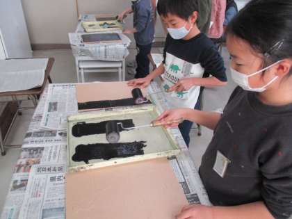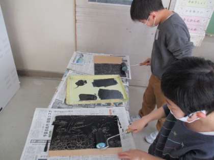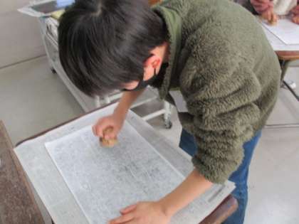 模様等の線を書いたり、型押しをしたりしたスチレン板に、インクをつけ、版を刷りました。インクの付き具合を確かめながら、ローラーを転がしました。バレンでこすると、痕を付けた部分が白く紙に写りました。